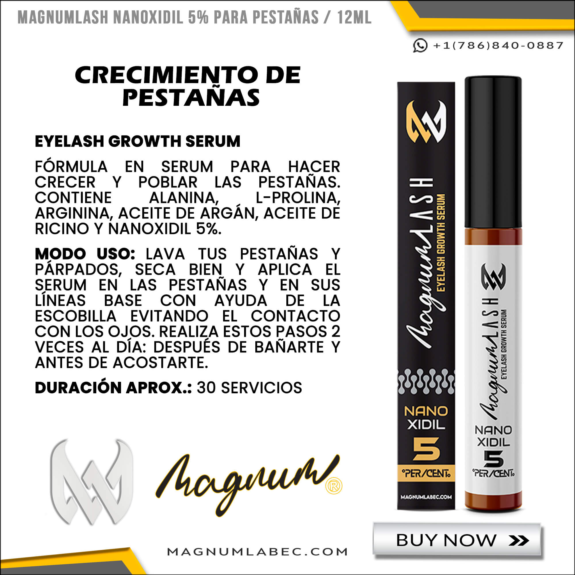 FÓRMULA EN SERUM PARA HACER CRECER Y POBLAR LAS PESTAÑAS. CONTIENE ALANINA, L-PROLINA, ARGININA, ACEITE DE ARGÁN, ACEITE DE RICINO Y NANOXIDIL 5%.